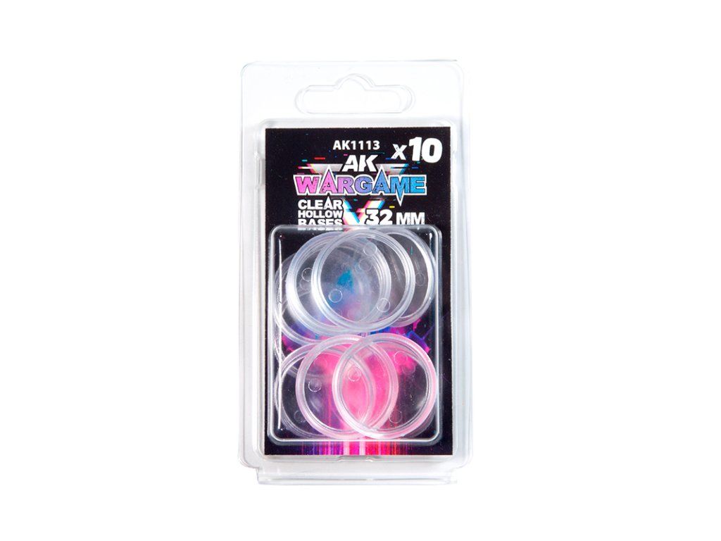 AK Interactive Hollow Bases je sada kulatých plastových podstavců o průměru 32 mm určených pro figurky a miniatury do wargamingu a stolních her. Podstavce mají zkosený okraj a dutý vnitřní prostor, který umožňuje vytvářet realistické scénické efekty – například vodu, lávu, krátery nebo hlubší terénní prvky.