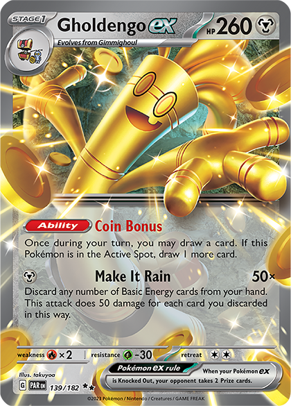 Na závěr se s formátem rozloučí i „zábavný“ Metal-type Gholdengo ex. Tento deck sice nedominoval turnajům ani zdaleka tak jako Gardevoir ex nebo Charizard ex, ale v posledních měsících své legality byl konzistentně jednou z nejpopulárnějších voleb na turnajích. Velkou roli v tom sehrálo vydání Solrock a Lunatone, které decku výrazně pomohly jak v rychlosti, tak v konzistenci. Absence jakéhokoliv damage stropu a zároveň téměř nulová možnost ho efektivně disruptovat z něj dělaly obzvlášť náročného soupeře pro pomalejší decky, které se snaží ustát jeden či dva útoky.