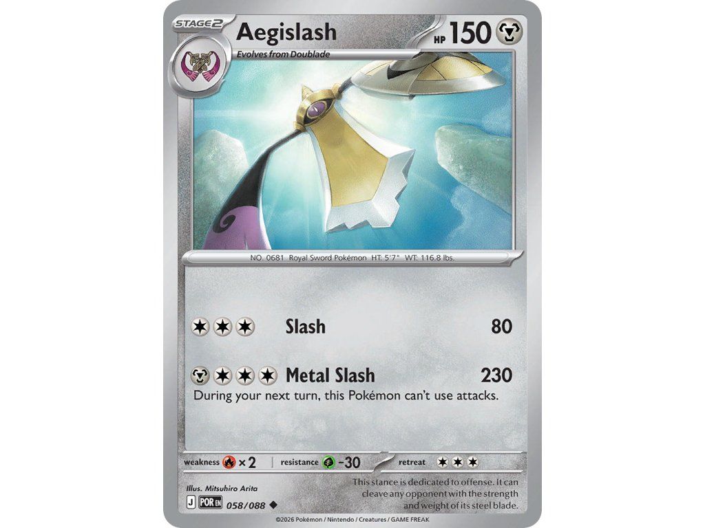Tato Pokémon TCG kusová karta Aegislash je z edice Perfect Order. Tato karta je Uncommon rarity a má regulační značku J.