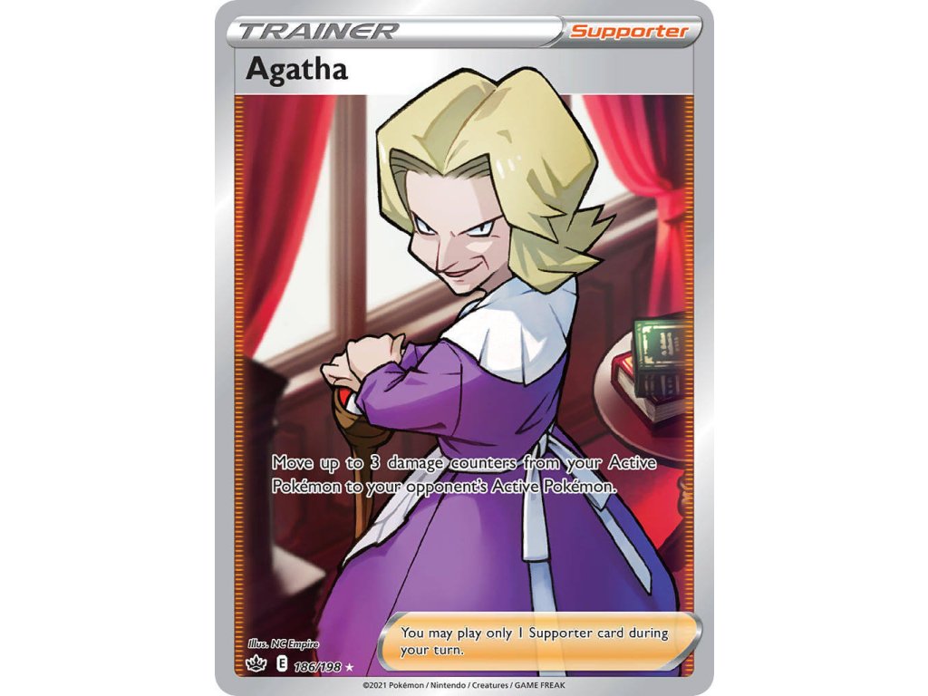 Tato Pokémon TCG kusová karta Agatha je z edice Chilling Reign. Tato karta je Ultra Rare rarity a má regulační značku E.