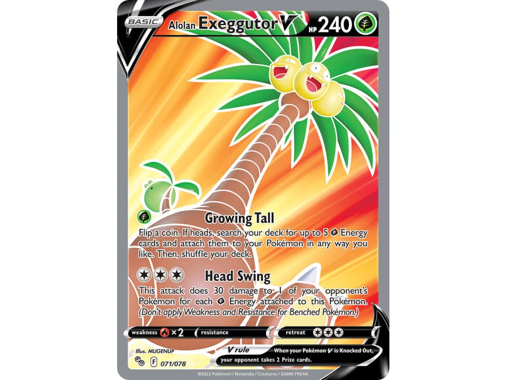 Tato Pokémon TCG kusová karta Alolan Exeggutor V je z edice Pokémon GO. Tato karta je Ultra Rare rarity a má regulační značku F.