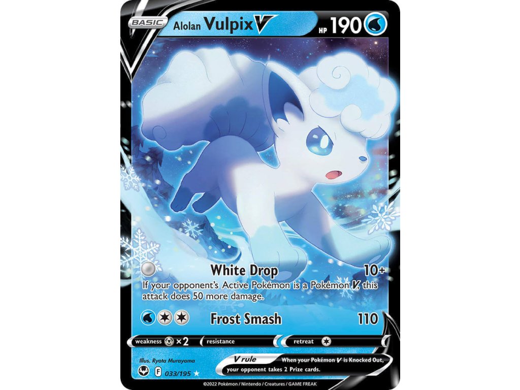 Tato Pokémon TCG kusová karta Alolan Vulpix V je z edice Silver Tempest. Tato karta je Ultra Rare rarity a má regulační značku F.