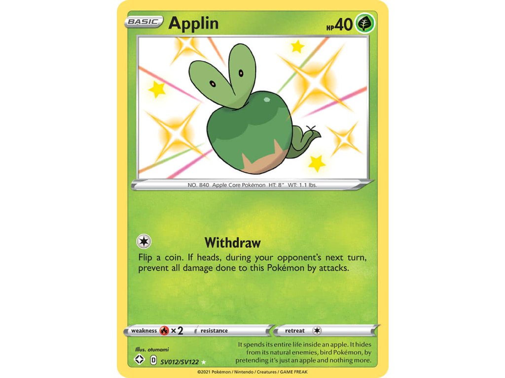 Tato Pokémon TCG kusová karta Applin je z edice Shining Fates. Tato karta je Shiny Rare rarity a má regulační značku D.
