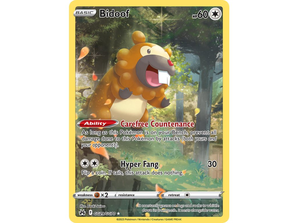 Tato Pokémon TCG kusová karta Bidoof je z edice Crown Zenith. Tato karta je Illustration Rare rarity a má regulační značku F.
