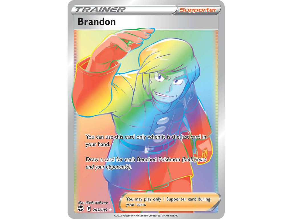 Tato Pokémon TCG kusová karta Brandon je z edice Silver Tempest. Tato karta je Rainbow Rare rarity a má regulační značku F.