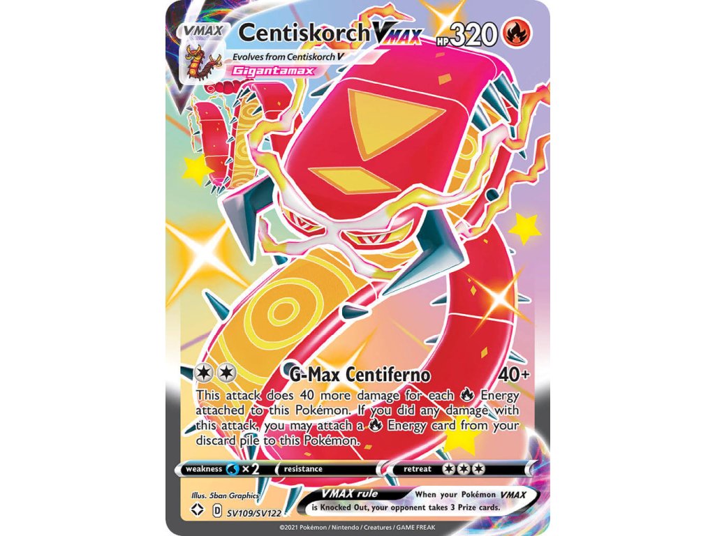Tato Pokémon TCG kusová karta Centiskorch VMAX je z edice Shining Fates. Tato karta je Shiny Ultra Rare rarity a má regulační značku D.