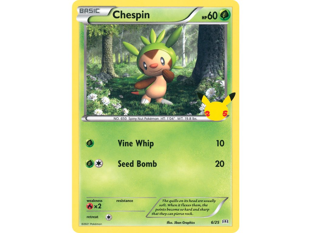 Tato Pokémon TCG kusová karta Chespin je z McDonald's Collection 25th Anniversary. Tato karta je Promo rarity.