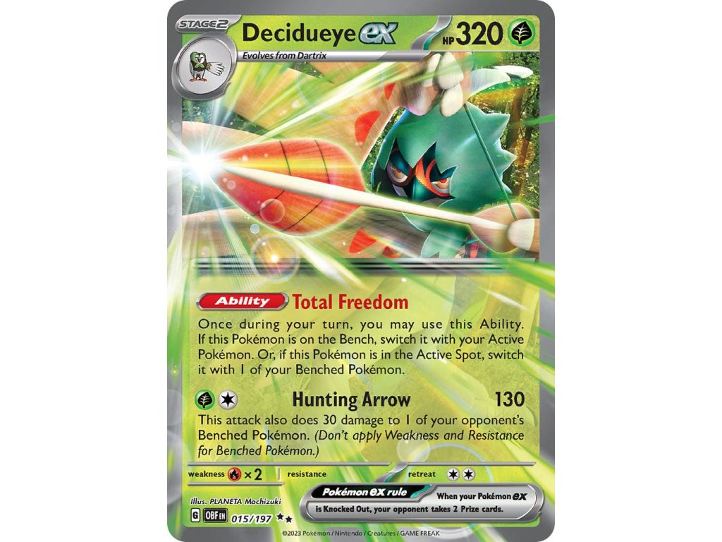 Tato Pokémon TCG kusová karta Decidueye ex je z edice Obsidian Flames. Tato karta je Double Rare rarity a má regulační značku G.