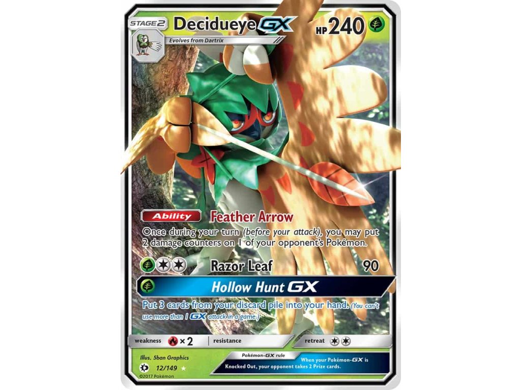Tato Pokémon TCG kusová karta Decidueye GX je z edice Sun & Moon. Tato karta je Ultra Rare rarity.
