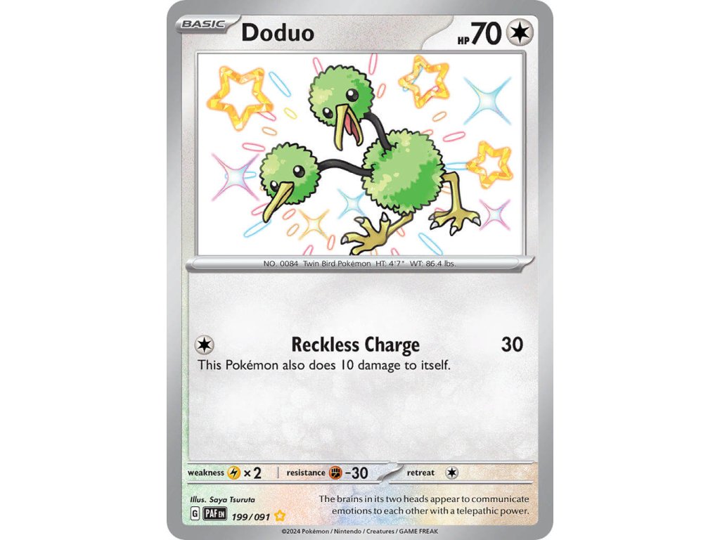Tato Pokémon TCG kusová karta Doduo je z edice Paldean Fates. Tato karta je Shiny Rare rarity a má regulační značku G.