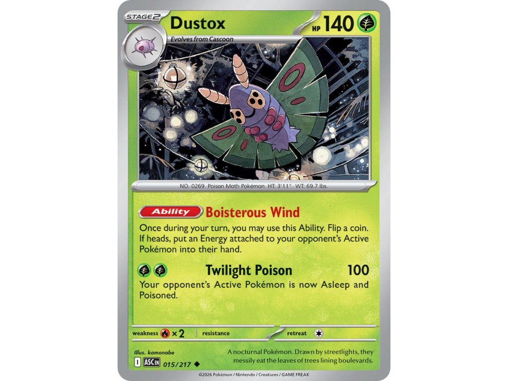 Tato Pokémon TCG kusová karta Dustox je z edice Ascended Heroes. Tato karta je Uncommon rarity a má regulační značku I.