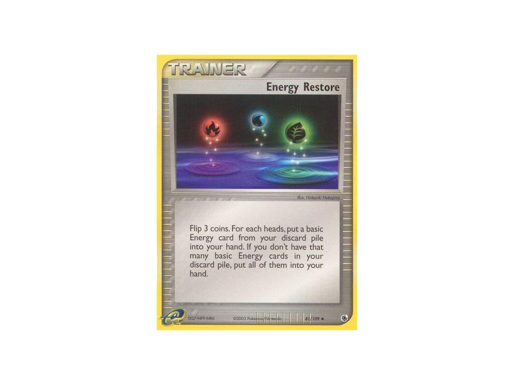 Tato Pokémon TCG kusová karta Energy Restore je z edice EX Ruby & Sapphire. Tato karta je Uncommon rarity.