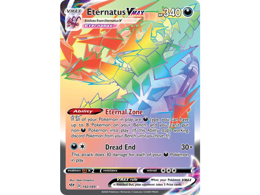 Tato Pokémon TCG kusová karta Eternatus VMAX je z edice Darkness Ablaze. Tato karta je Rainbow Rare rarity a má regulační značku D.