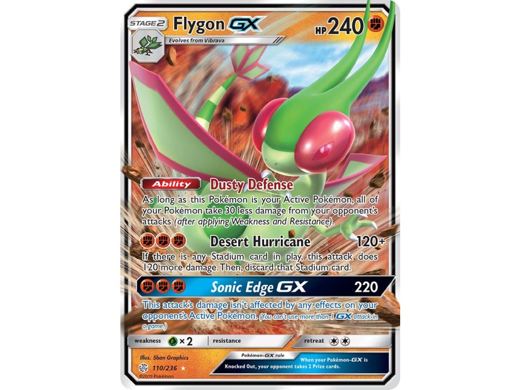 Tato Pokémon TCG kusová karta Flygon GX je z edice Cosmic Eclipse. Tato karta je Ultra Rare rarity.