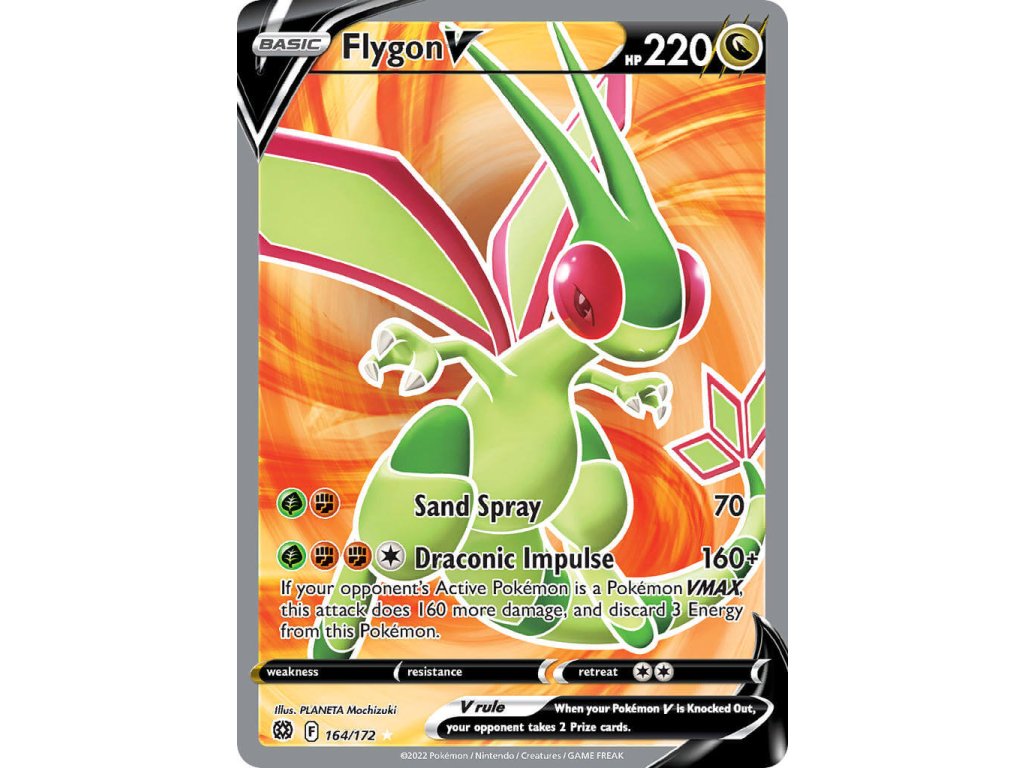 Tato Pokémon TCG kusová karta Flygon V je z edice Brilliant Stars. Tato karta je Ultra Rare rarity a má regulační značku F.
