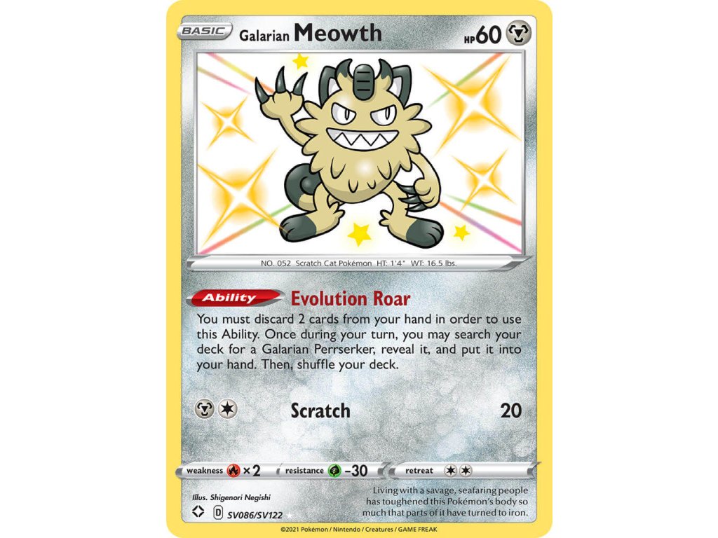 Tato Pokémon TCG kusová karta Galarian Meowth je z edice Shining Fates. Tato karta je Shiny Rare rarity a má regulační značku D.