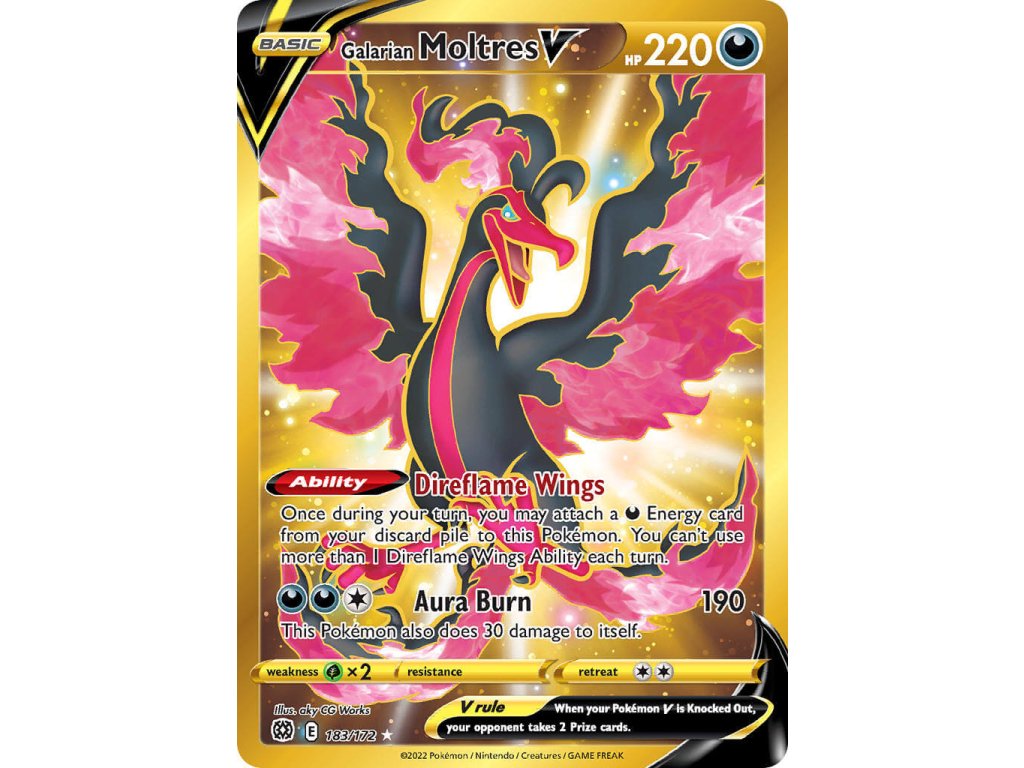 Tato Pokémon TCG kusová karta Galarian Moltres V je z edice Brilliant Stars. Tato karta je Secret Rare rarity a má regulační značku E.