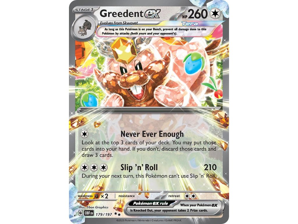 Tato Pokémon TCG kusová karta Greedent ex je z edice Obsidian Flames. Tato karta je Double Rare rarity a má regulační značku G.