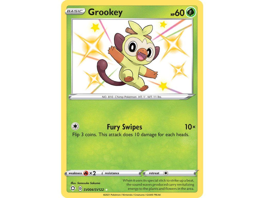 Tato Pokémon TCG kusová karta Grookey je z edice Shining Fates. Tato karta je Shiny Rare rarity a má regulační značku D.