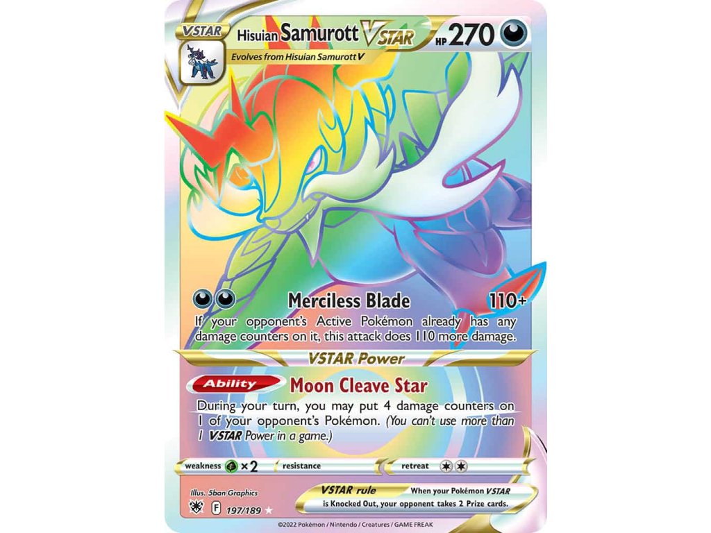 Tato Pokémon TCG kusová karta Hisuian Samurott VSTAR je z edice Astral Radiance. Tato karta je Rainbow Rare rarity a má regulační značku F.
