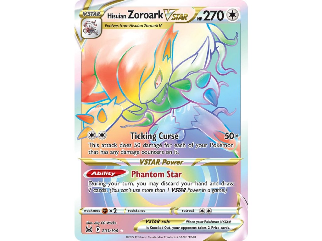 Tato Pokémon TCG kusová karta Hisuian Zoroark VSTAR je z edice Lost Origin. Tato karta je Rainbow Rare rarity a má regulační značku F.