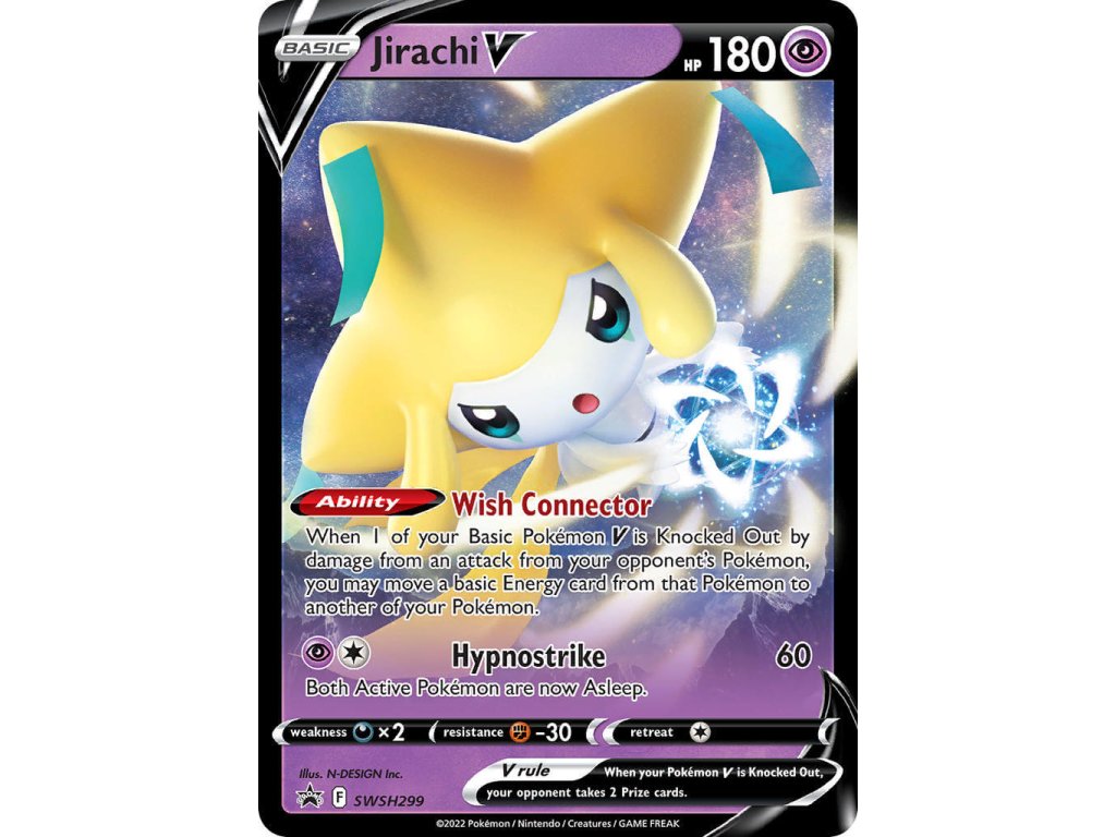 Tato Pokémon TCG kusová karta Jirachi V je SWSH Black Star Promo. Tato karta má regulační značku F.