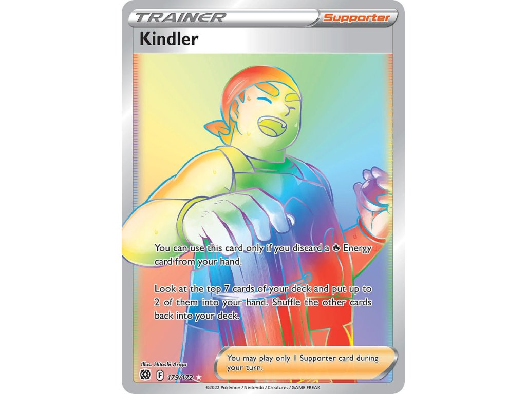 Tato Pokémon TCG kusová karta Kindler je z edice Brilliant Stars. Tato karta je Rainbow Rare rarity a má regulační značku F.