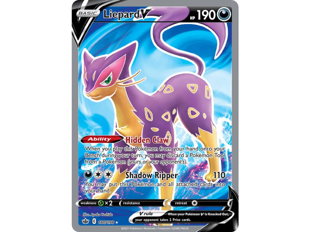 Tato Pokémon TCG kusová karta Liepard V je z edice Chilling Reign. Tato karta je Ultra Rare rarity a má regulační značku E.