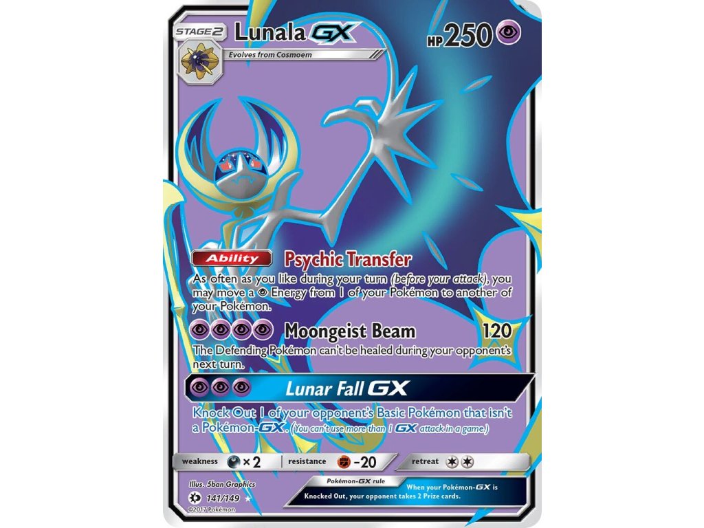 Tato Pokémon TCG kusová karta Lunala GX je z edice Sun & Moon. Tato karta je Ultra Rare rarity.