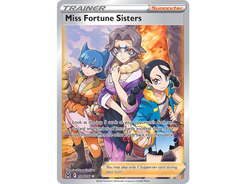 Tato Pokémon TCG kusová karta Miss Fortune Sisters je z edice Lost Origin. Tato karta je Ultra Rare rarity a má regulační značku F.