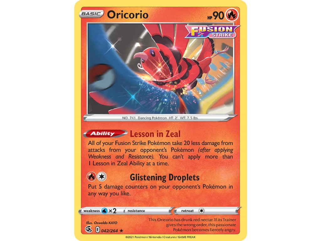 Tato Pokémon TCG kusová karta Oricorio je z edice Fusion Strike. Tato karta je Rare rarity a má regulační značku E.