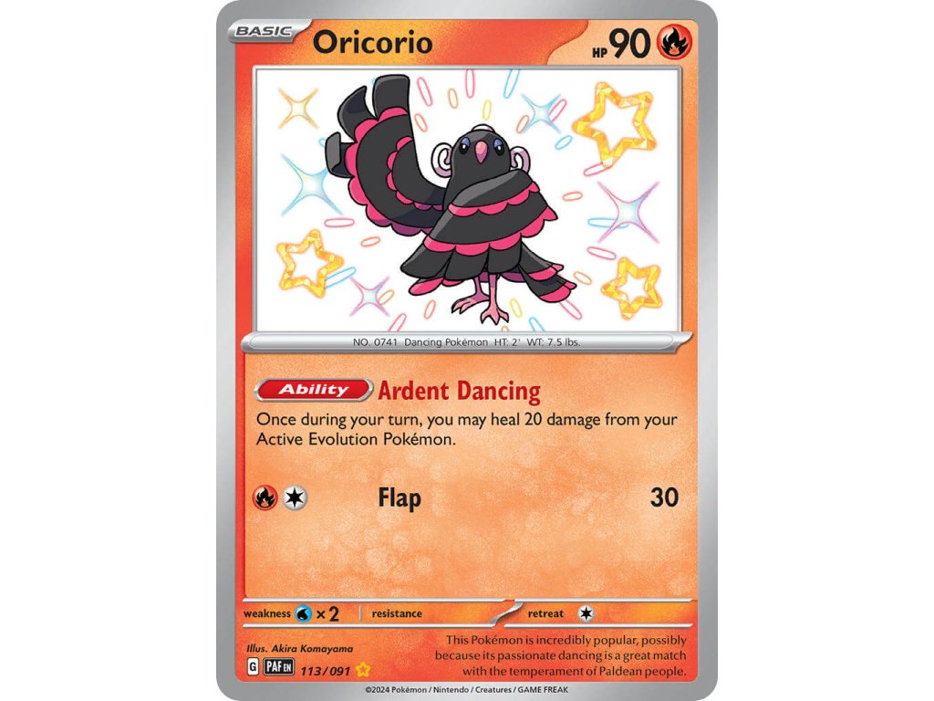 Tato Pokémon TCG kusová karta Oricorio je z edice Paldean Fates. Tato karta je Shiny Rare rarity a má regulační značku G.