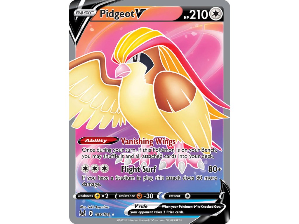 Tato Pokémon TCG kusová karta Pidgeot V je z edice Lost Origin. Tato karta je Ultra Rare rarity a má regulační značku F.