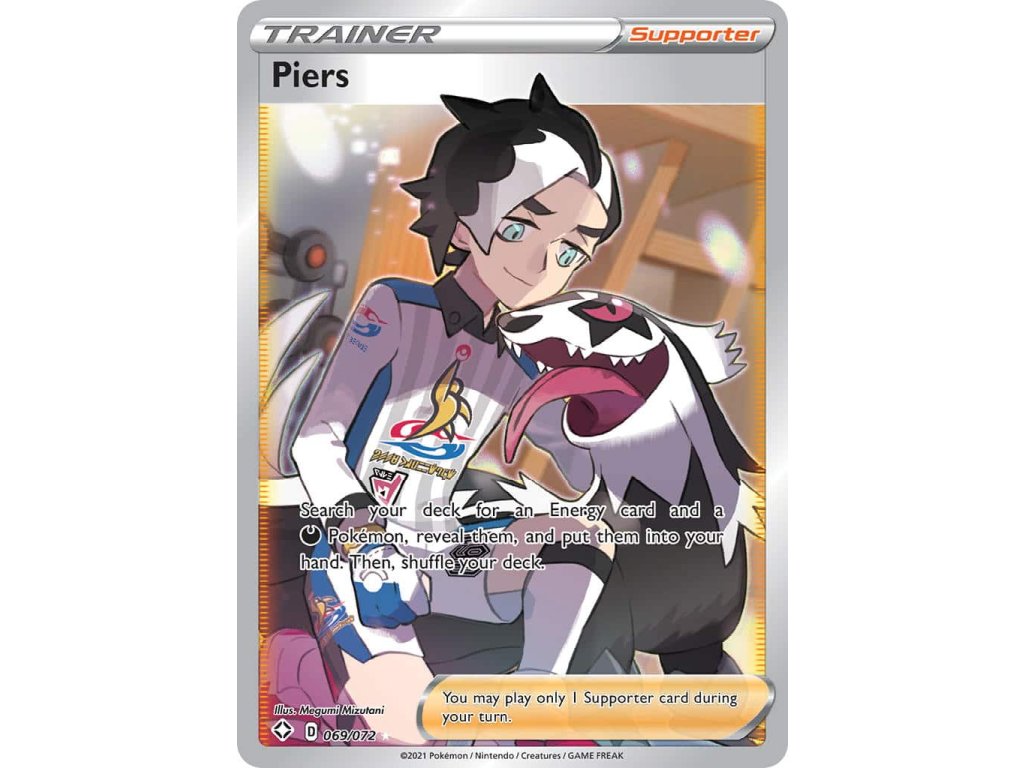 Tato Pokémon TCG kusová karta Piers je z edice Shining Fates. Tato karta je Ultra Rare rarity a má regulační značku D.