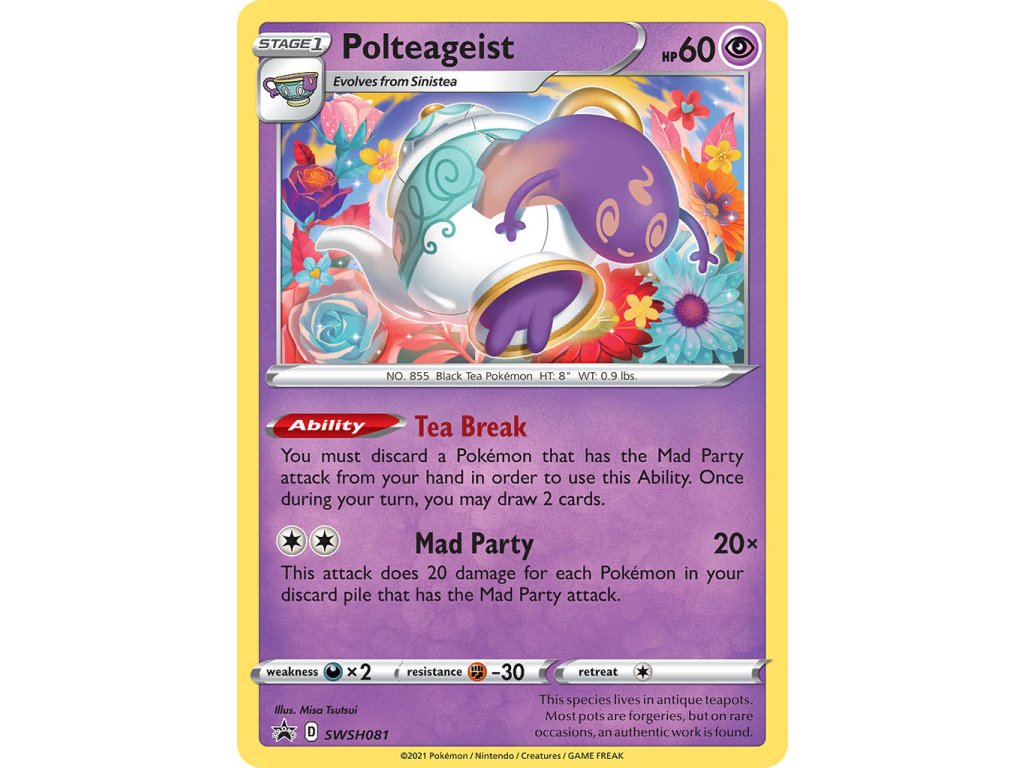 Tato Pokémon TCG kusová karta Polteageist je SWSH Black Star Promo. Tato karta je Promo rarity má regulační značku D.