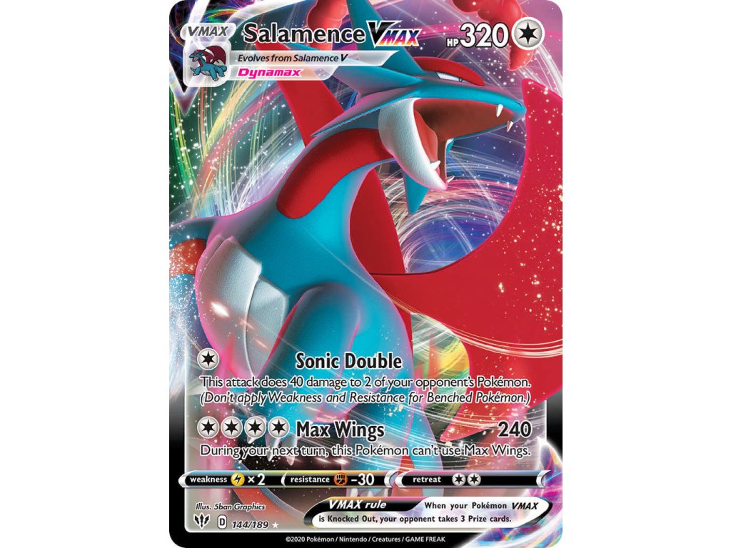 Tato Pokémon TCG kusová karta Salamence VMAX je z edice Darkness Ablaze. Tato karta je Ultra Rare rarity a má regulační značku D.