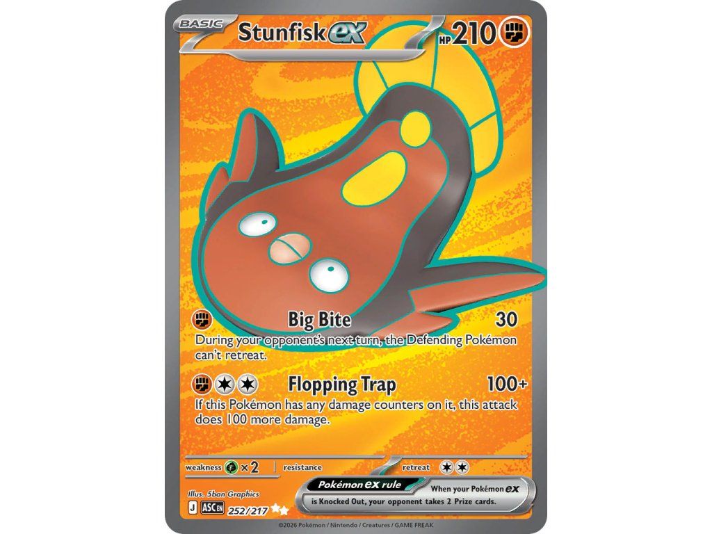 Tato Pokémon TCG kusová karta Stunfisk ex je z edice Ascended Heroes. Tato karta je Ultra Rare rarity a má regulační značku J.