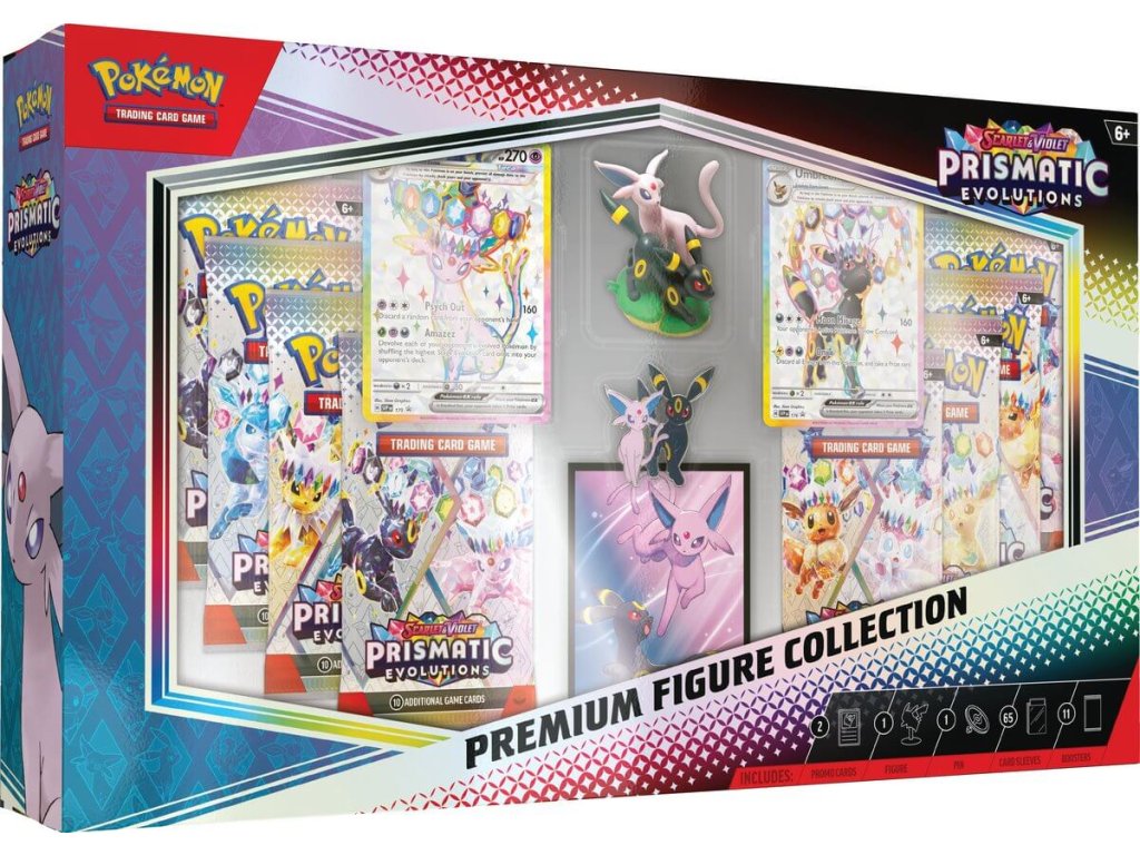 Uvnitř této edice najdete hned 11 boosterů z rozšíření Prismatic Evolutions, díky kterým můžete rozšířit svou sbírku o nové karty a posílit své herní balíčky. Těšit se můžete také na dvě exkluzivní etched foilové promo karty Umbreon ex a Espeon ex, které se stanou ozdobou každé sbírky.
