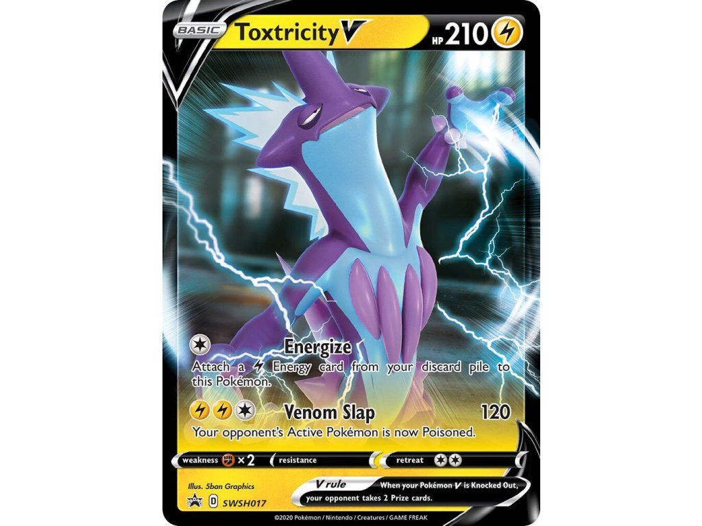 Tato Pokémon TCG kusová karta Toxtricity V je SWSH Black Star Promo. Tato karta má regulační značku D.