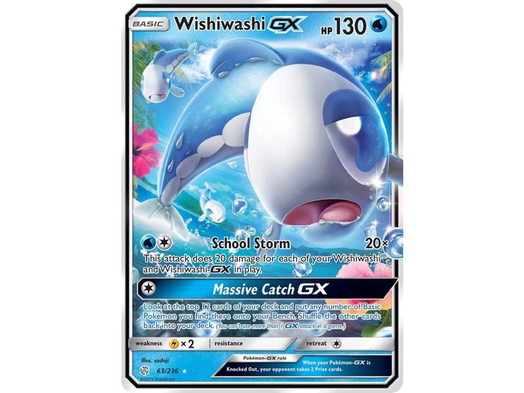 Tato Pokémon TCG kusová karta Wishiwashi GX je z edice Cosmic Eclipse. Tato karta je Ultra Rare rarity.