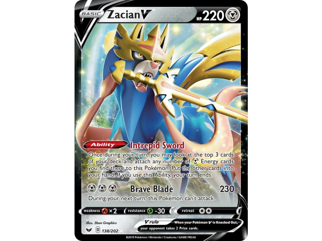 Tato Pokémon TCG kusová karta Zacian V je z edice Sword & Shield. Tato karta je Ultra Rare rarity a má regulační značku D.