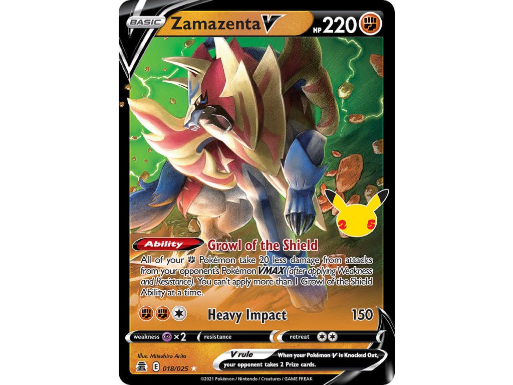 Tato Pokémon TCG kusová karta Zamazenta V je z edice Celebrations. Tato karta je Ultra Rare rarity a má regulační značku E.