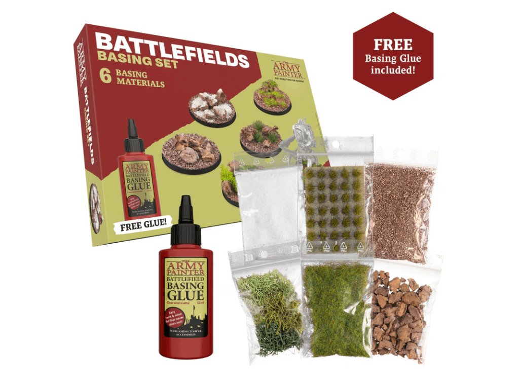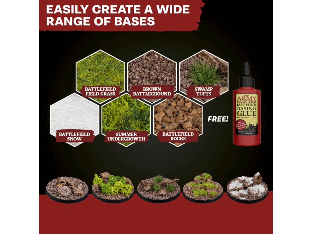 Tento výhodný „one box fits all“ set zahrnuje základní materiály pro modelářské podstavce a scény – od kamínků a travin až po sníh. Sada je navržena tak, aby pokryla široké spektrum prostředí: od letních bitevních polí po zasněžené krajiny. Součástí je také lepidlo Battlefields Basing Glue (50 ml).