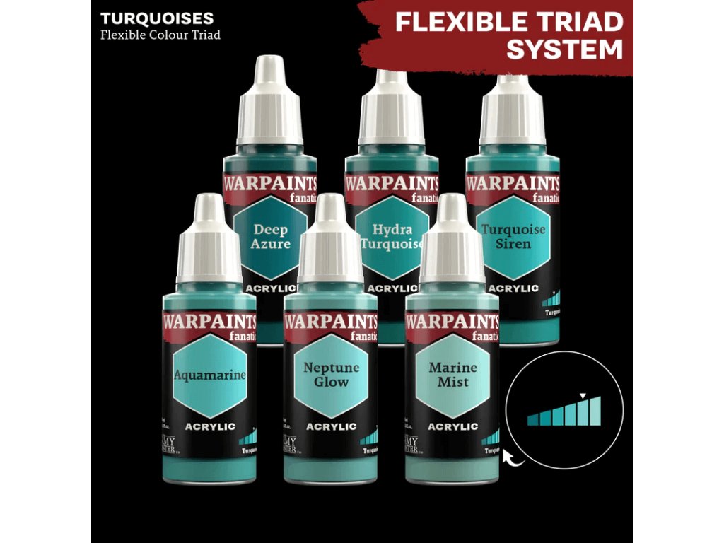 The Warpaints Fanatic: Neptune Glow je zeleno-modrá, která se dobře hodí jako světlé zvýraznění nebo vrchní vrstva pro tyrkysové projekty. Je druhým nejsvětlejším tónem z flexibilní barevné triády „Turquoises“ a jeho praktický název je „Světle zeleno-modrá“.